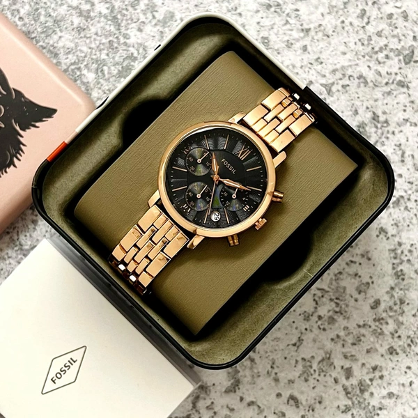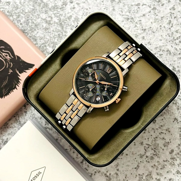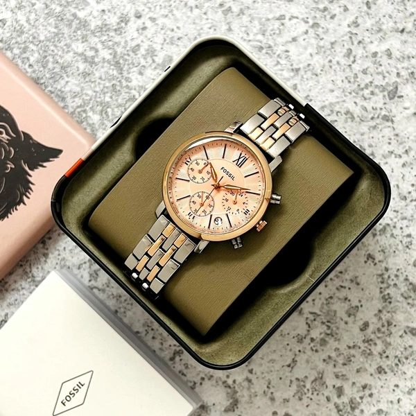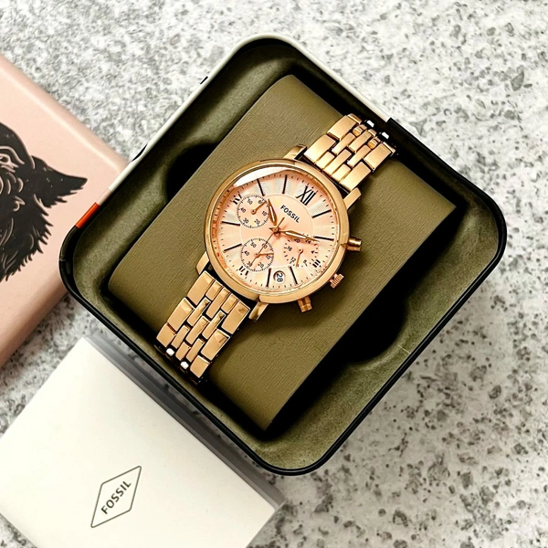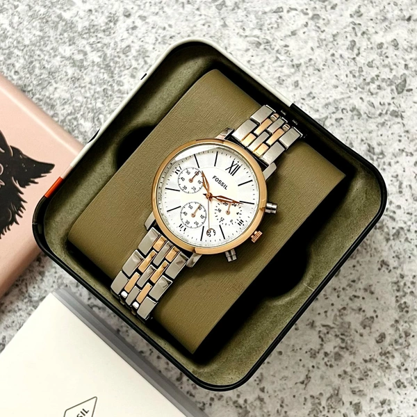 *Features*: Powered by original Quartz Chronograph machinery, Stainless-steel, Rose and Rose two-tone polished round case with bezel with minute markings and band Fossil Strap mineral crystal glass on dial fastened by a push-button deployment clasp installed with Orginial butterfly pushing lock system, Chronograph working